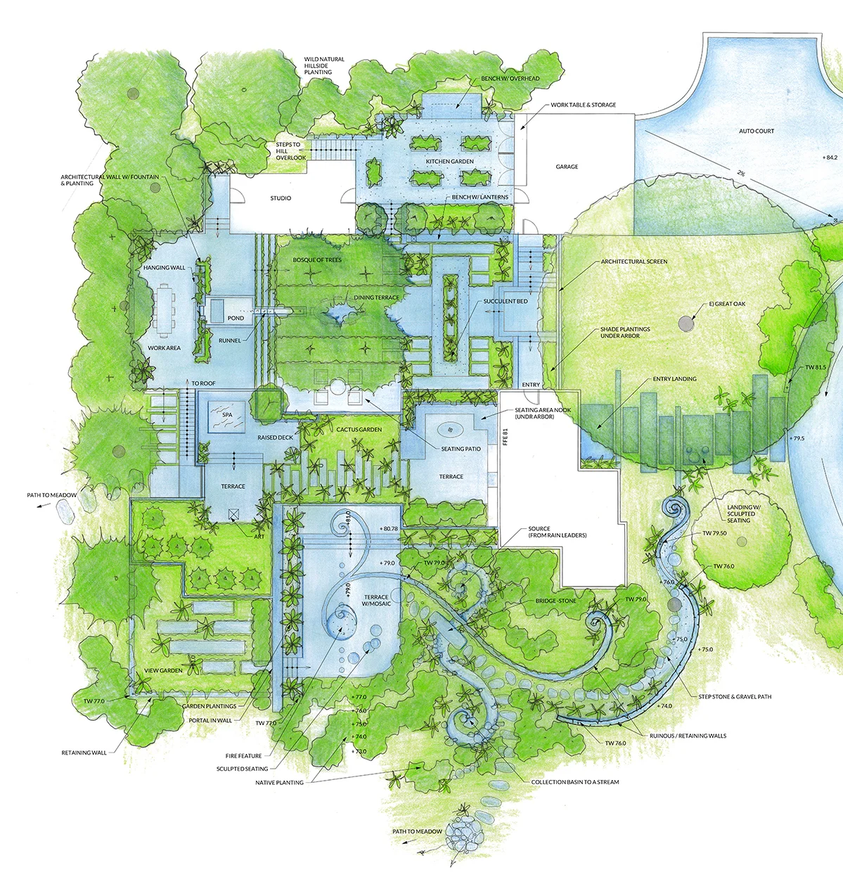 A series of rectangles can be stacked, offset, shifted and rotated. They can be rendered in varying materials of vary sizes. This is an infinitely workable form and easily reinforced with pre-fabricated elements like planters.